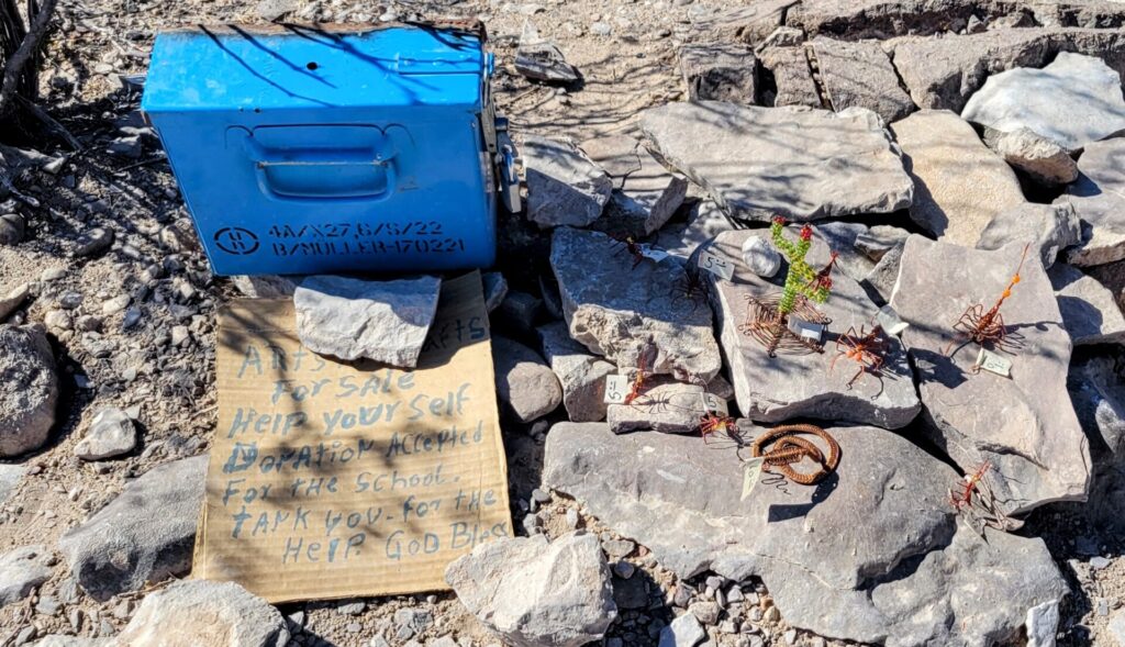 Our next stop that day was at the Rio Grand Village Nature Trail. This walk led down to the river and offered some nice views. We discovered that many of the trails that bordered the river, have Mexican tchotchkes for sale, most of which were figures made out of wrapped wire. Mexican men rode their horses across the river border to put out these handmade items. Each collection of items for sale has a lockbox next to it where you can deposit U.S. dollars.