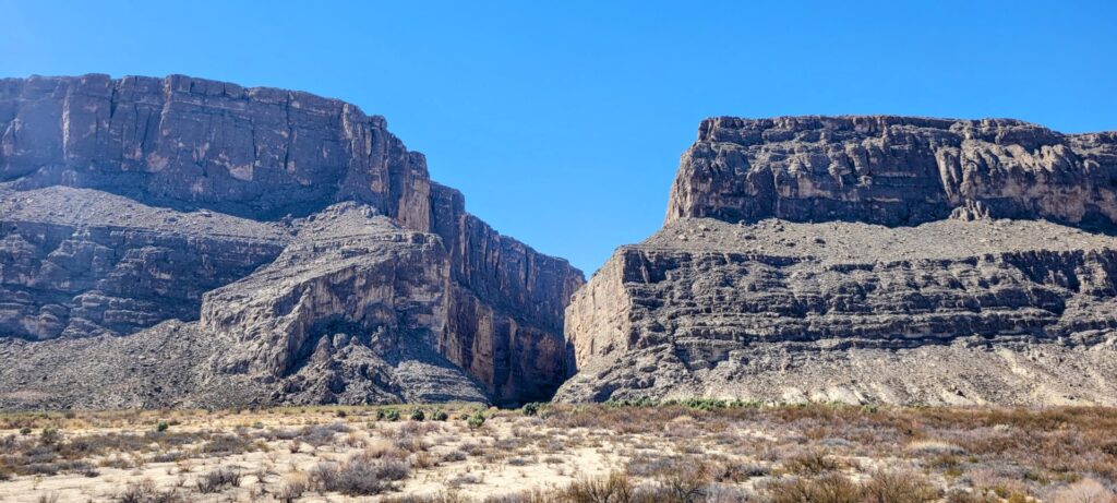 Our primary destination that day was Santa Elena Canyon, which was my most anticipated site on the trip to Big Bend. Despite the Sotol overlook being approximately 14 miles from Santa Elena Canyon, you could actually see it as an obvious notch in the distant mesa. And as we drove closer to the canyon we pulled over several times to get photos of it.