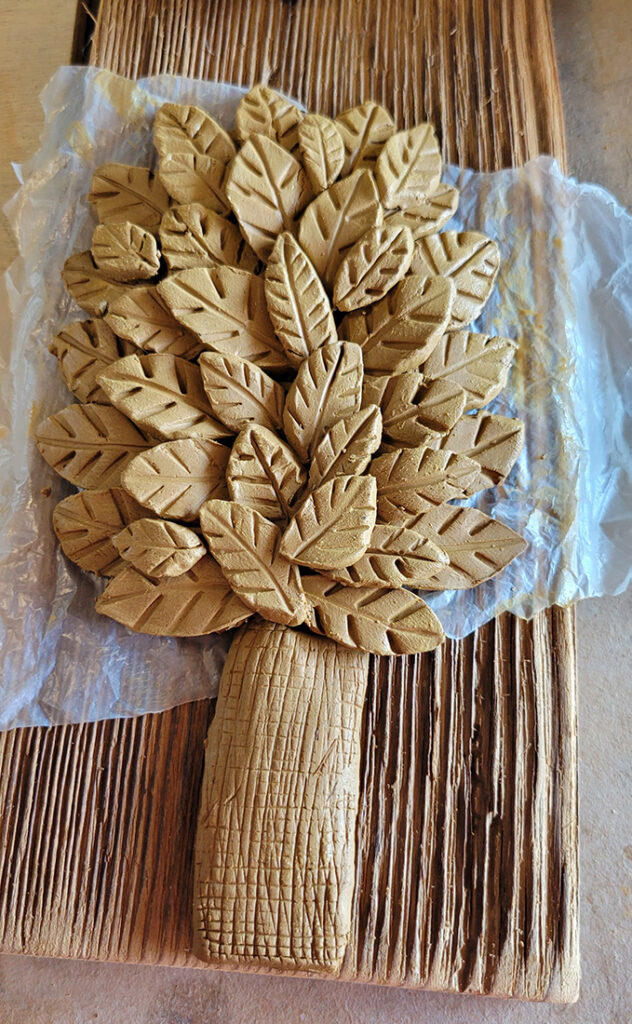 Some of the other chores I did included painting the radiators in the house, cleaning miscellaneous things, weeding between the cracks in the walkways, weeding the garden, scraping out old caulking from around the kitchen sink, helping to wax the tile floors of the wrap-around porch (by hand, on our knees). I only got to help in the pottery studio a few times. Once to clean and wedge the recycled clay and once to sand and clean the old wooden boards used for the background of the ceramic mosaics. Also, on my last day, Hedwige showed me how to make clay leaves by hand and assemble them into a tree.