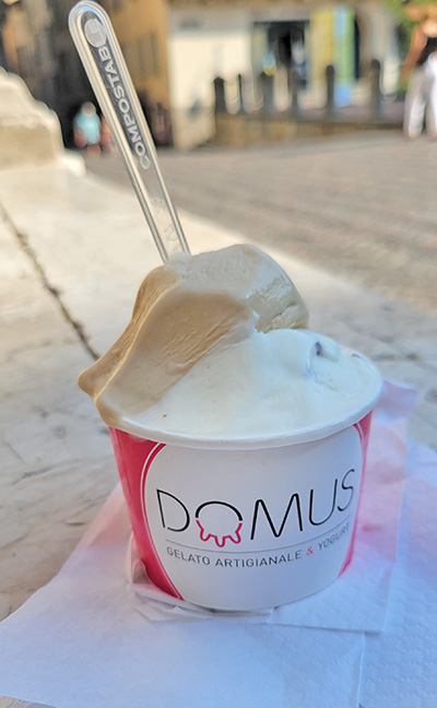 Once I was up in the old city, I just wandered around taking in the sights. I noticed shops selling focaccia loaded with different toppings, and I treated myself to some gelato. Bergamo is known for stracciatella gelato which was invented there, so I felt the need to try it. Honestly, I found it boring. It was just cream with specks of shaved chocolate. It occurred to me that vanilla gelato isn’t common in Italy. Their “plain” gelato is simply the flavor of cream.